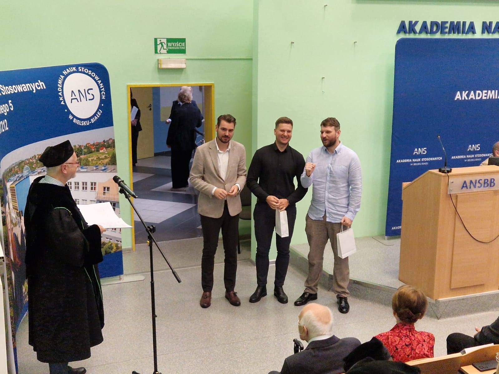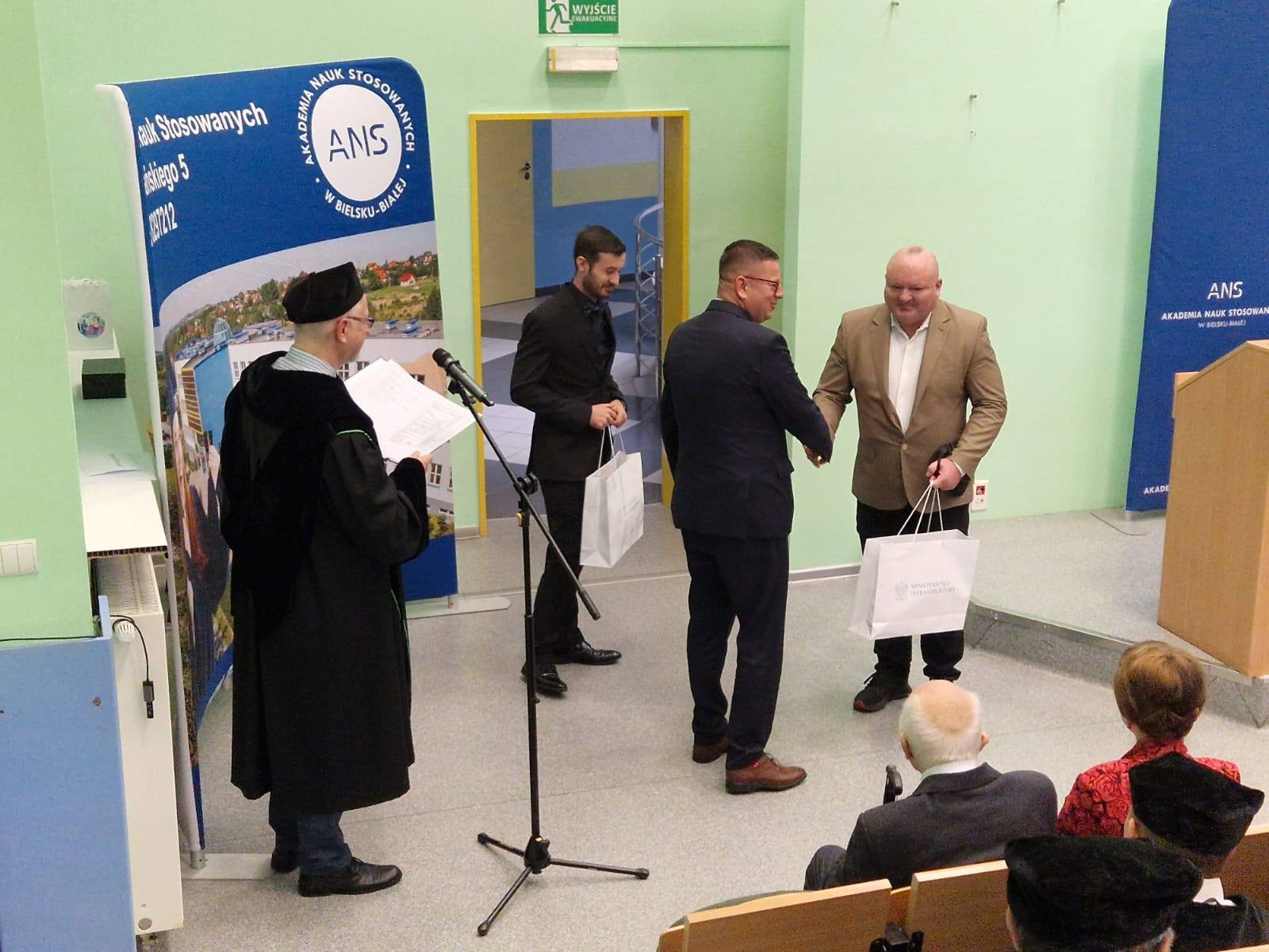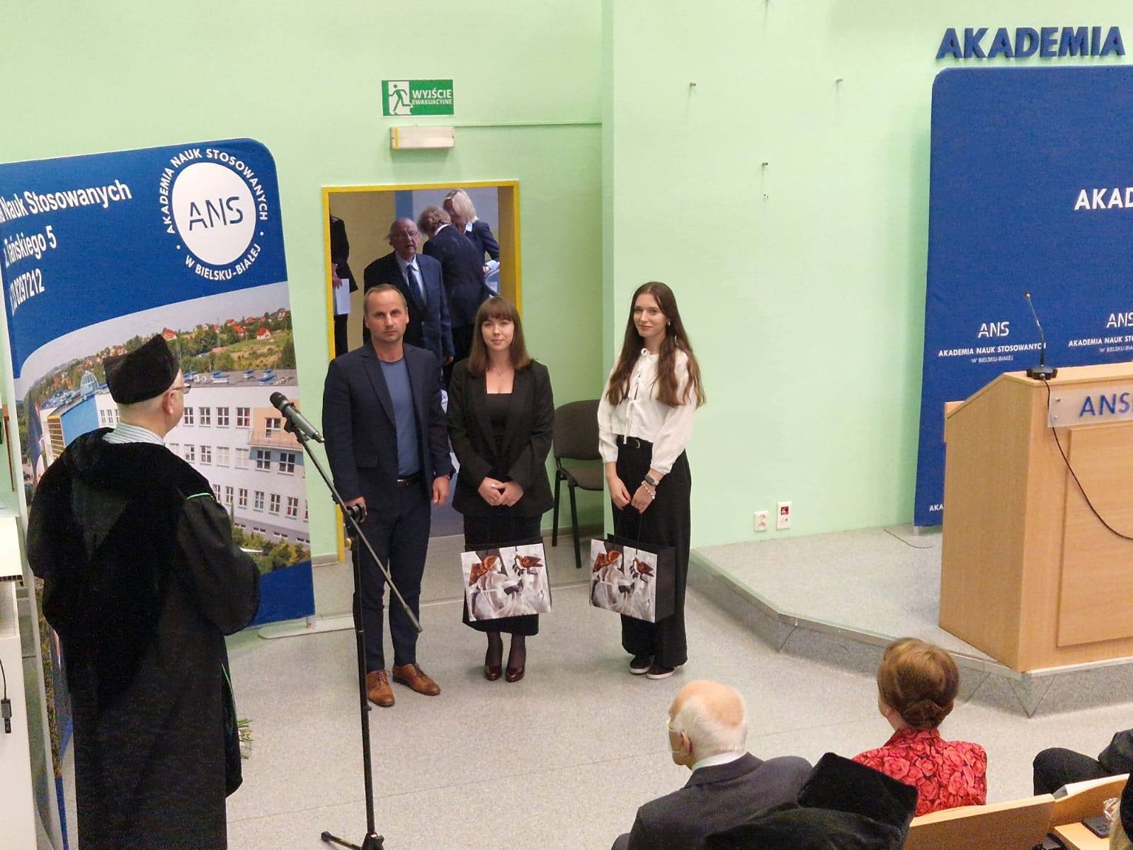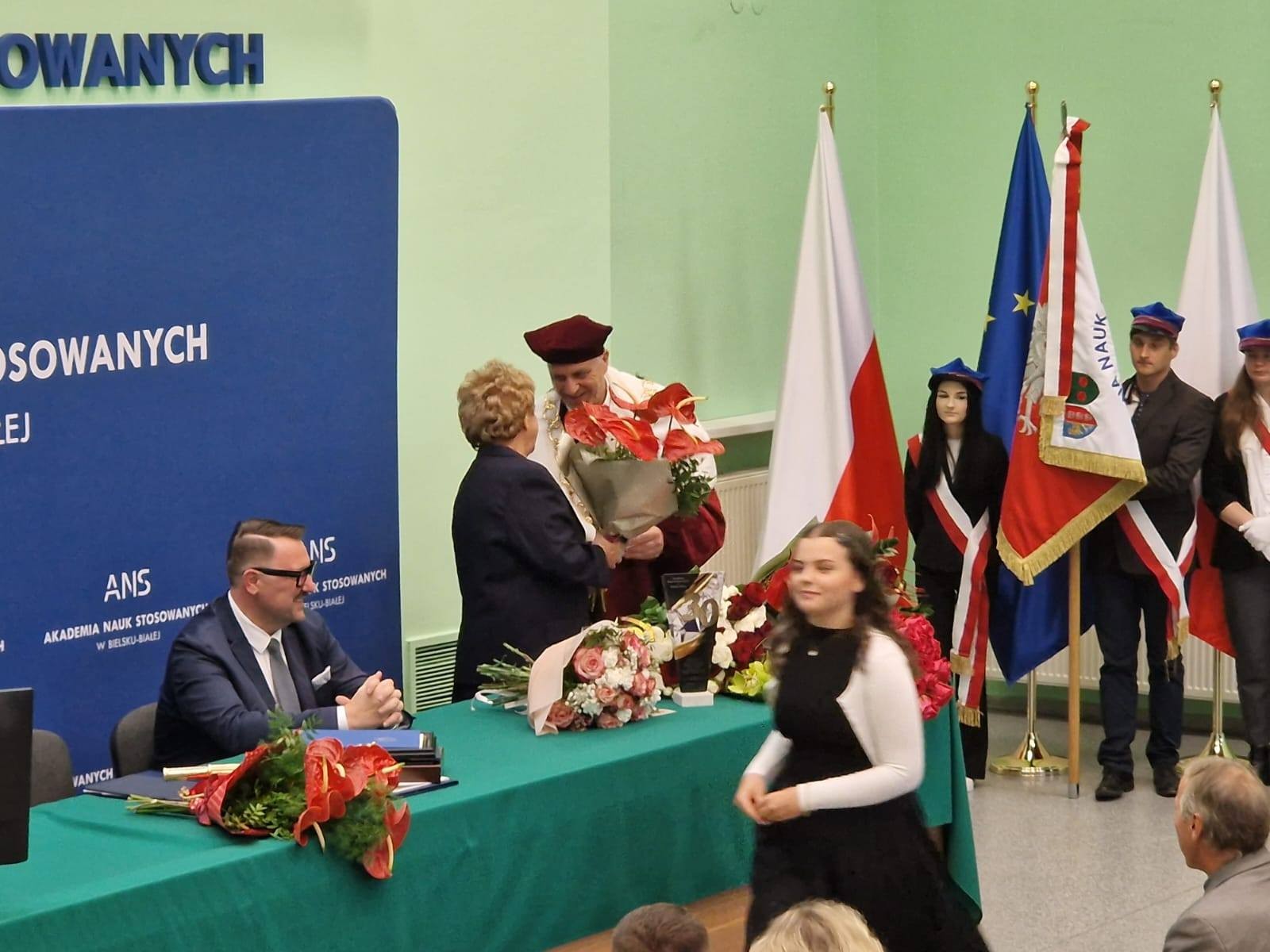 Jego Magnificencja dr hab. inż. Jacek Binda, prof. ANSBB, w swoim wystąpieniu przypomniał o trzydziestoletniej drodze Uczelni – od młodej uczelni na ul. Dworkowej do prężnie rozwijającej się Akademii, która kształci specjalistów poszukiwanych w całym kraju. „Nasza historia to historia ludzi – wykładowców, którzy budowali tę Uczelnię od podstaw, i studentów, którzy od trzech dekad nadają jej sens” – mówił Rektor Binda. W trakcie uroczystości Władze Uczelni oraz przybyli goście uhonorowali osobę szczególnie zasłużoną dla rozwoju Uczelni Panią mgr Szarlotę Bindę – założycielkę i dyrektor generalną ANSBB. Posłanka do Parlamentu Europesjkiego Mirosłąwa Nykiel uhonorowała Panią Dyrektor Genralną statuetką MIRAcle European Woman. Statuetkę Jubileuszową za zasługi dla Pani Dyrektor Szarloty Bindy i Akademii wręczyli również Pani Senator RP Agnieszka Gorogoń-Komor, Pan Prezydent Bielska-Białej Jarosław Klimaszewski, Pan Prezes Maciej Jeleń z Beskidzkiej Izby Gospodarczej, Burmistrz Miasta Czechowice- Dziedzice dr Marian Błachut.