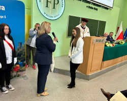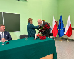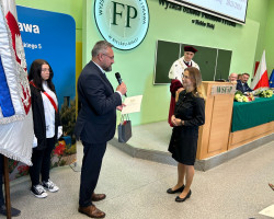 Następnie przyszedł czas na wyjątkowy moment, którym było wręczenie wyróżnienia dla Pani Dyrektor Generalnej mgr Szarloty Bindy przez Poseł na Sejm RP Mirosławę Nykiel wraz z Prezesem Beskidzkiej Izby Gospodarczej, Panem Maciejem Jeleniem. To wyraz uznania dla profesjonalizmu i współpracy w zakresie kształcenia kadr dla środowiska biznesowego, co stanowi ważny aspekt działalności uczelni. To synergia edukacji akademickiej i praktyki zawodowej, co jest kluczowym elementem kształcenia przyszłych liderów i specjalistów.