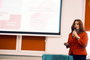 Pierwszą osobą, która wystąpiła podczas Konferencji, była Pani Agnieszka Herma – Naczelnik Wydziału Edukacji i Sportu Urzędu Miejskiego w Bielsku-Białej. Pani Naczelnik zaprezentowała oczekiwania pracodawców względem młodych pracowników oraz kompetencje, które są najbardziej pożądane na współczesnym rynku pracy.