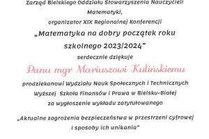 30 września 2023 roku r. w Regionalnym Ośrodku Doskonalenia Nauczycieli „WOM” w Bielsku-Białej odbyła się XIX Regionalna Konferencja Bielskiego Oddziału Stowarzyszenia Nauczycieli Matematyki „Matematyka na dobry początek roku szkolnego 2023/2024”. Wykład otwierający Konferencję wygłosił mgr Mariusz Kuliński, prodziekan Wydziału Nauk Społecznych i Technicznych.