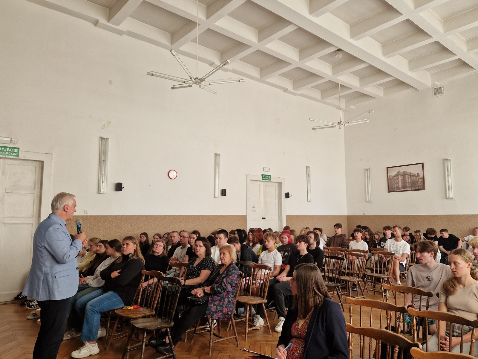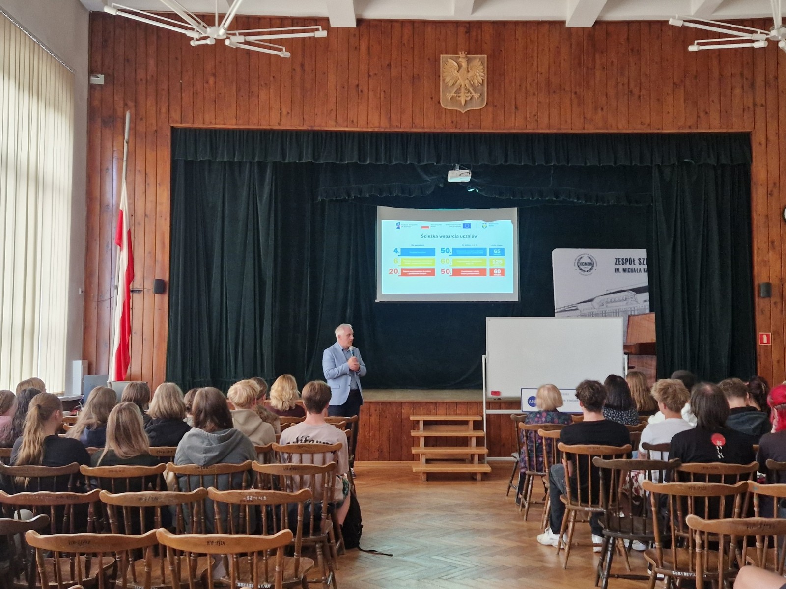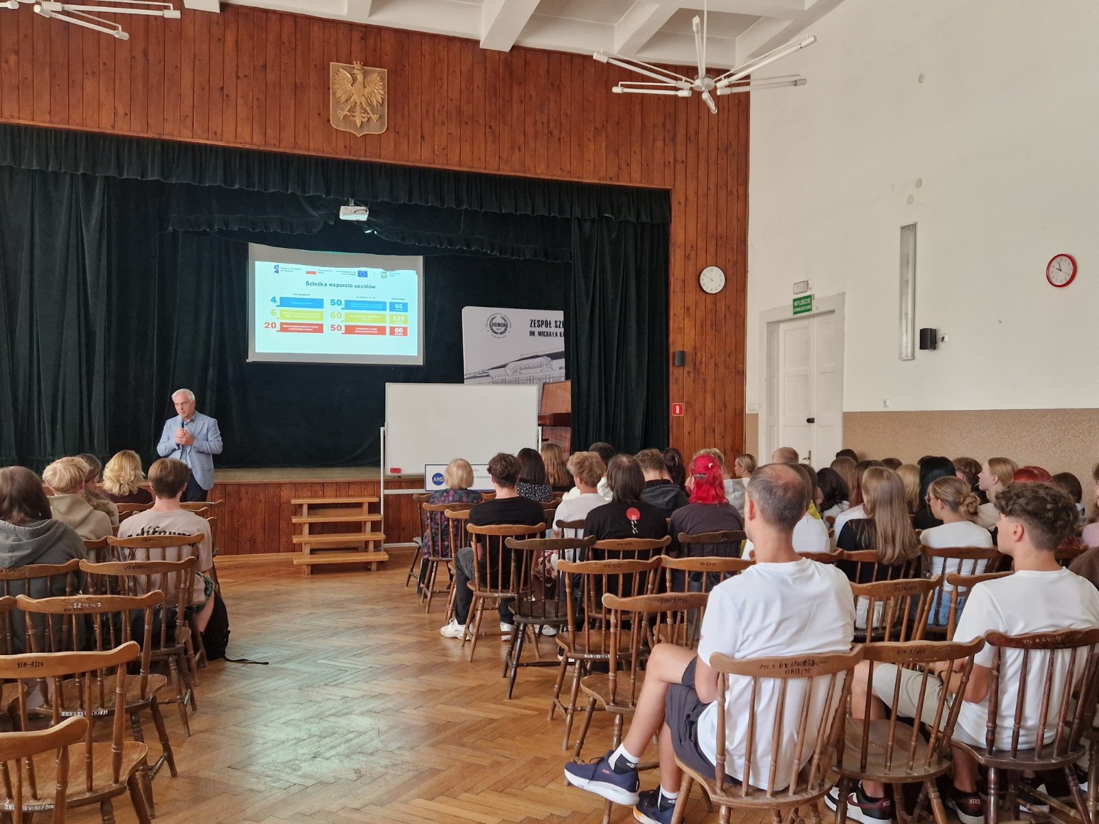 Podczas spotkania zachęcaliśmy uczniów do aktywnego udziału w projekcie i pokazaliśmy, jak dzięki wsparciu ze środków Funduszy Europejskich dla Śląskiego 2021–2027 mogą zdobywać cenne doświadczenia i przygotować się na wyzwań przyszłości.